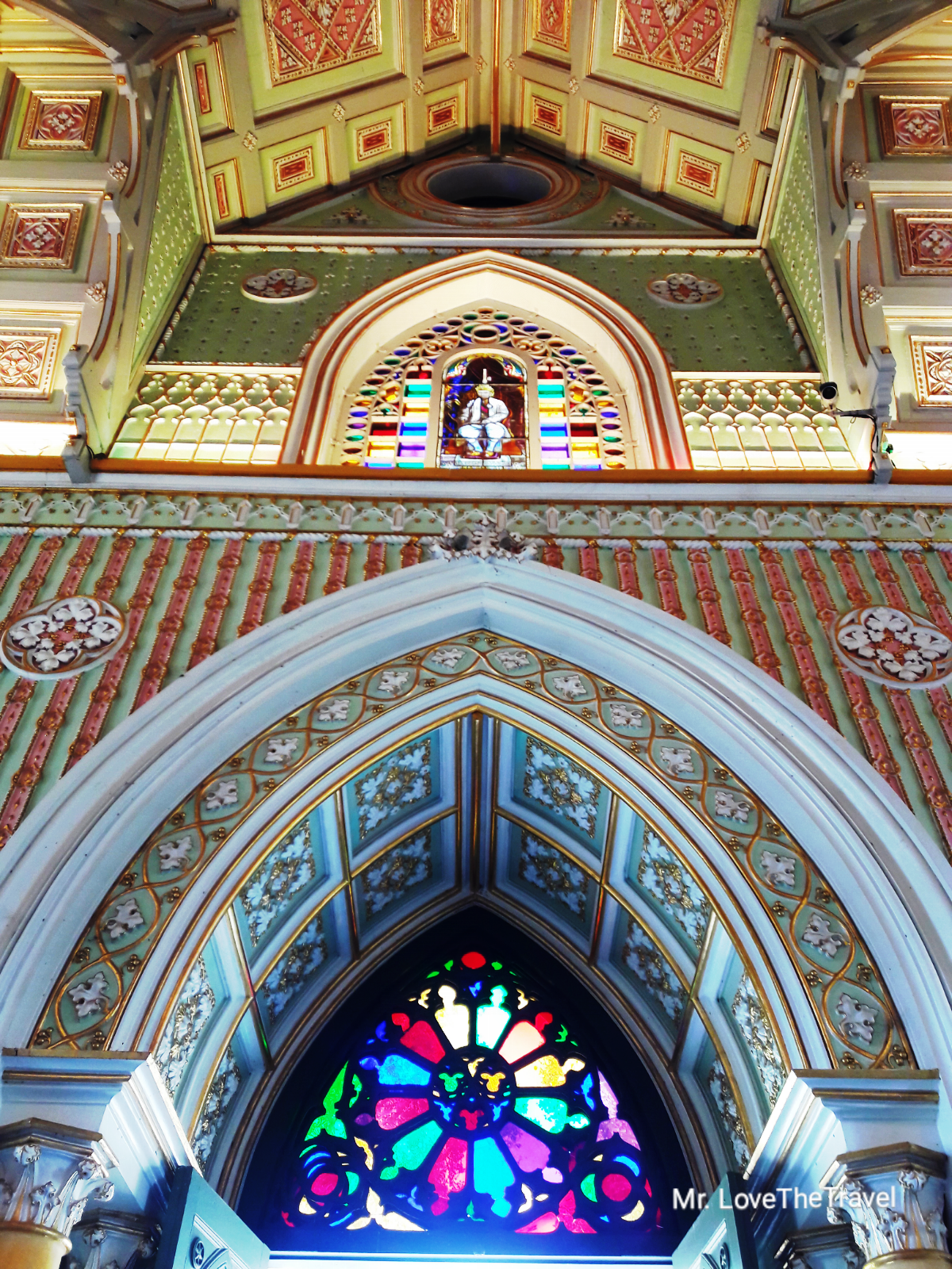 ภายในพระอุโบสถมีการประดับตกแต่งที่สวยงามด้วยกระจกหลากสีตามรูปแบบของโบสถ์ในคริสตศาสนาทั่วไป นอกจากนี้ที่ผนังของอุโบสถตรงเหนือประตูทางเข้ามีภาพกระจากหลากสีลงยาพระบรมฉาลักษณ์ของในหลวงรัชกาลที่ 5 ไว้เหนือประตูพระอุโบสถด้วย