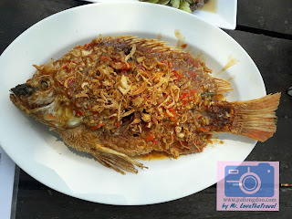 และแล้ว…เมนูที่สองก็มาถึง เมนูนี้ก็เพื่อสุขภาพนิดหน่อย นั่นก็คือ (แอ่น…แอ้น…แอ๊น!!) ปลาทับทิมราดพริกนั่นเอง!! แบบว่า ไม่ใช่แค่ราดพริกนะครับ มีโรยสมุนไพรด้วย รสชาติเปรี้ยวหวาน และปลาทอดเนื้อนุ่มมากครับ รับประทานกับข้าวสวย บอกเลยอร่อยเหาะครับ!!