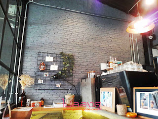 ร้านมีกาตกแต่งแบบแนวล๊อฟท์ ผนังอิฐสีโทนเทา ๆ ดูมีสไตล์ สบายตา นอกจากนี้อีกด้านหนึ่งของผนังร้านเป็นกระจกใส สามารถมองทะลุชมบรรยากาศของตลาดเรือบินได้อย่างชัดเจน