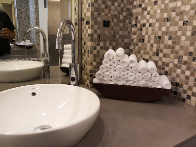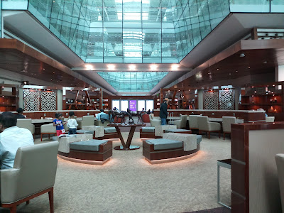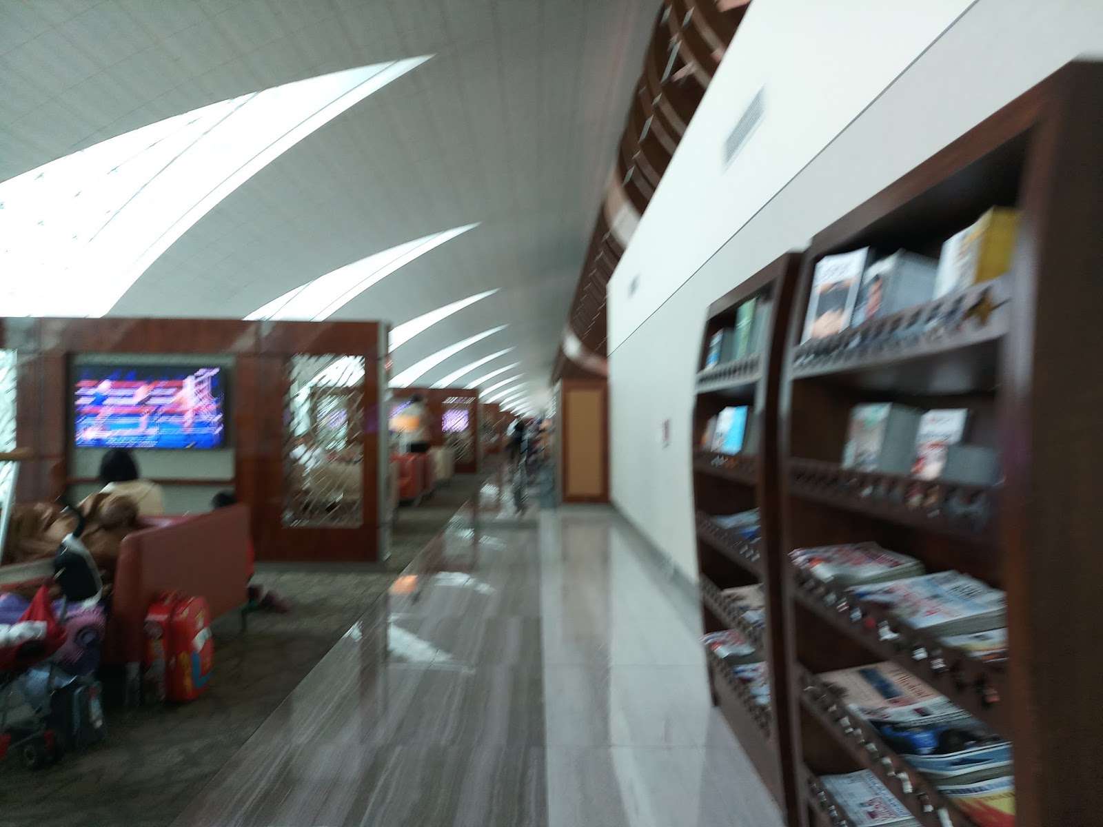เล้าจ์สายการบินเอมิเรท ที่สนามบินดูใบ เป็นพื้นที่เปิดกว้าง บนชั้น ๓ เป็นชั้นใต้หลังคา ดังนั้นอากาศที่นี่จึงค่อนข้างร้อน และร้อนมาก ๆ แม้แต่น้ำภายในห้องน้ำก็ยังร้อน ยังกะน้ำอุ่นเลยทีเดียว