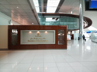 เลาจ์ของชั้นธุรกิจ สายการบินเอมิเรทซ์ที่สนามบินดูไบ ตั้งอยู่ที่ชั้น ๓ บริเวณใกล้ทางขึ้นเครื่องโซน B โดยจะแยกกันคนละส่วนกับผู้โดยสารชั้นหนึ่ง (First class) ก่อนเข้าใช้บริการต้องแสดงบัตรขึ้นเครื่อง จากนั้นเจ้าหน้าที่ภาคพื้นก็จะแจ้งข้อมูล เวลาและประตูขึ้นเครื่อง พร้อมทั้งแจ้งว่า ให้ผู้โดยสารดูเวลาขึ้นเครื่องด้วยตัวเอง เพราะที่สนามบินนี้เป็นสนามบินที่ไม่ใช้เสียง ไม่มีการประกาศแจ้งเตือน เมื่อเข้าใจข้อมูลแล้วก็เดินเข้าสู้ห้องพักผู้โดยสาร