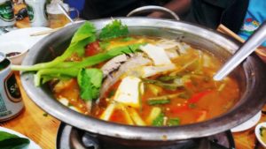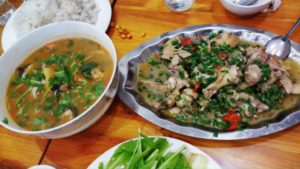 มองจากเมนู ทั้งหมดเป็นภาษาเวียดนาม แต่ก็ยังดีที่มีภาพให้ดูด้วย แบบว่า เป็ด ก็มาแบบเป็ดตัวเต็ม ๆ ให้ชี้เลือก แต่ขอบอกนะครับว่า หากสั่งอาหารประเภทเนื้อสัตว์ เป็ด ไก่ ปลา จะต้องรอหน่อย เพราะทางร้านจะทำกันสด ๆ ไม่มีเนื้อสัตว์แช่แข็ง และเป็นความเชื่อของคนถิ่นนี้ที่จะต้องรับประทานอาหารสดและใหม่เท่านั้น และถ้าหากอยากรับประทานเนื้แพะก็ต้องสั่งล่วงหน้าไว้ก่อนจึงจะมีมาเสิร์ฟ